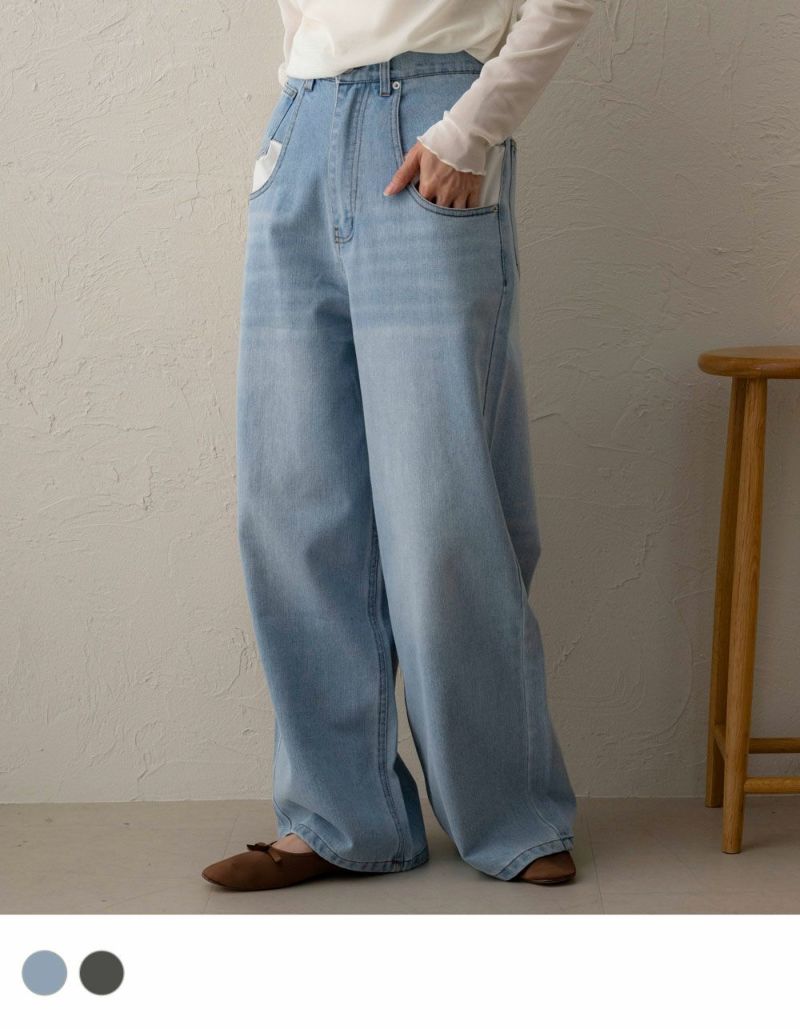 ポケットのデザインがアクセントになったワイドデニムパンツ。