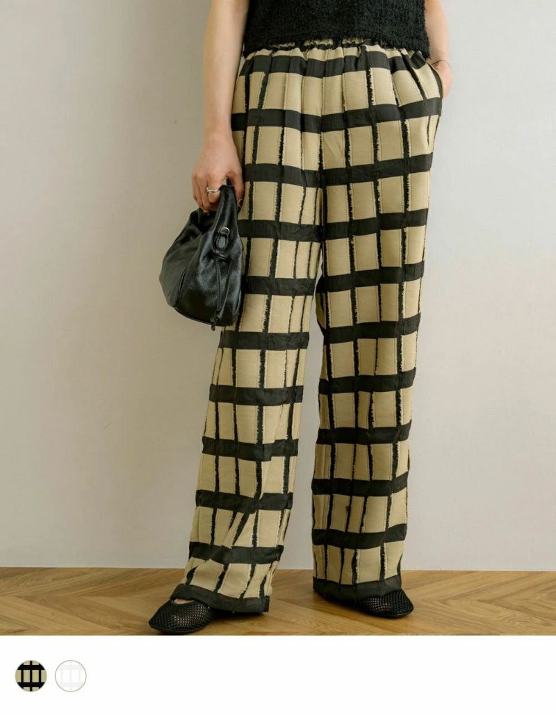 ブロックシアーのデザインが春夏らしく、爽やかで目を惹くワイドパンツ。ウエストゴムで楽ちんなのも嬉しいポイント♪
