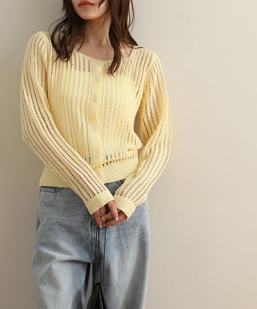 柔らかな透け感がとても気に入りました。スクエアネックのおかげで顔まわりがすっきり見えます。カーディガンとしても使えるから嬉しい。他の色もほしくなりました。