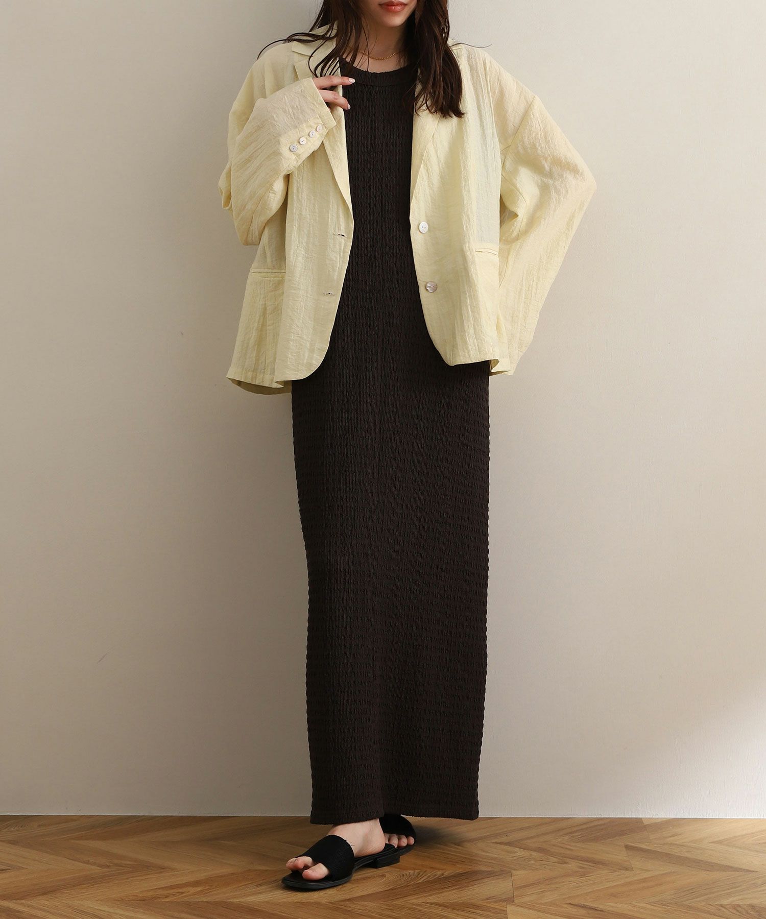 ブルーグレーの夏らしい爽やかなカラーが登場!ナチュラルなブルーが可愛らしいカラーです♪リップルの表情のある素材が春夏らしく大人可愛いロングワンピース♪