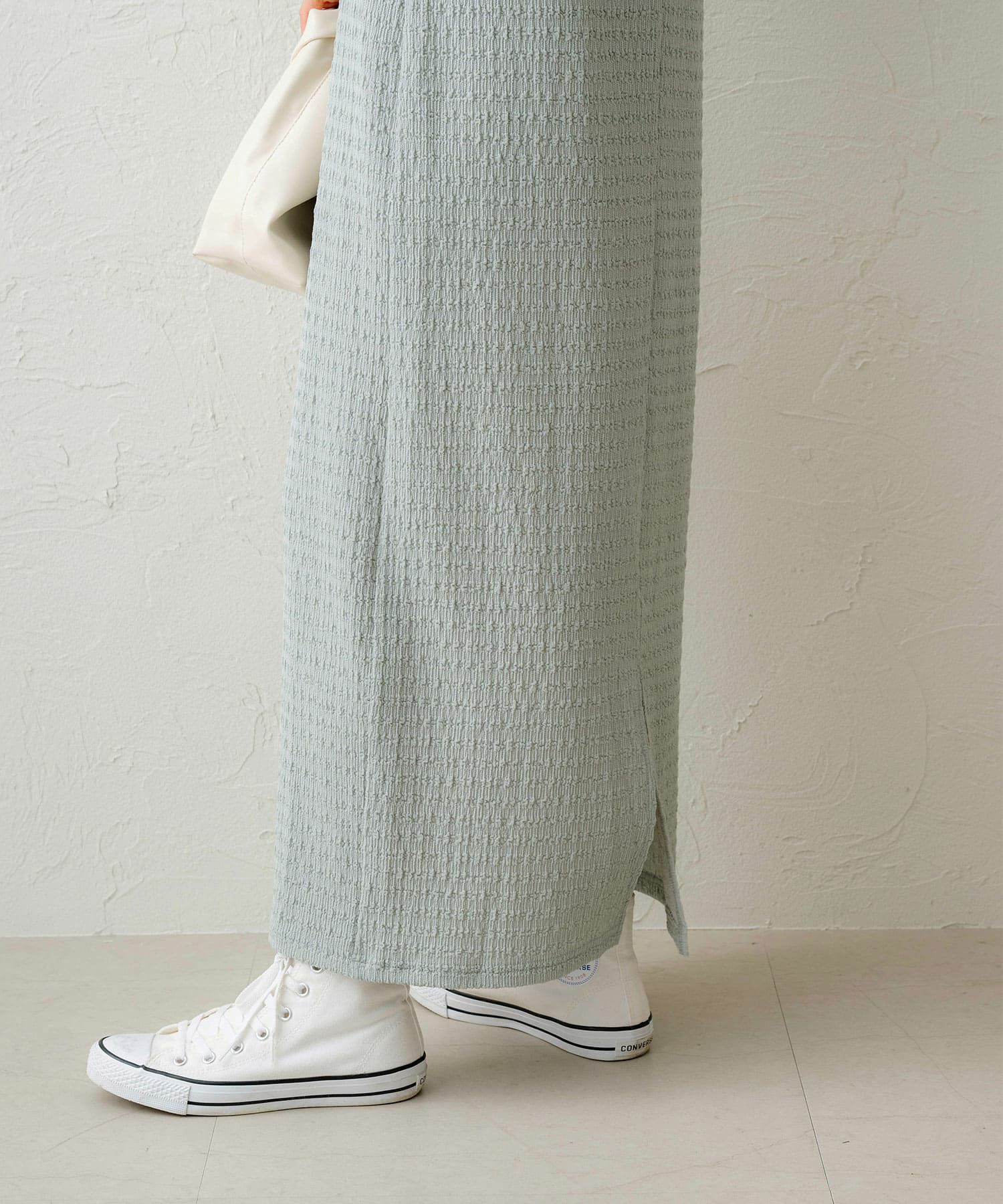 体のラインを拾いづらいナローシルエットでスタイルアップ効果◎真夏は1枚で、シャツやジャケットなどを羽織ったレイヤードスタイルでロングシーズン楽しめる1着です。