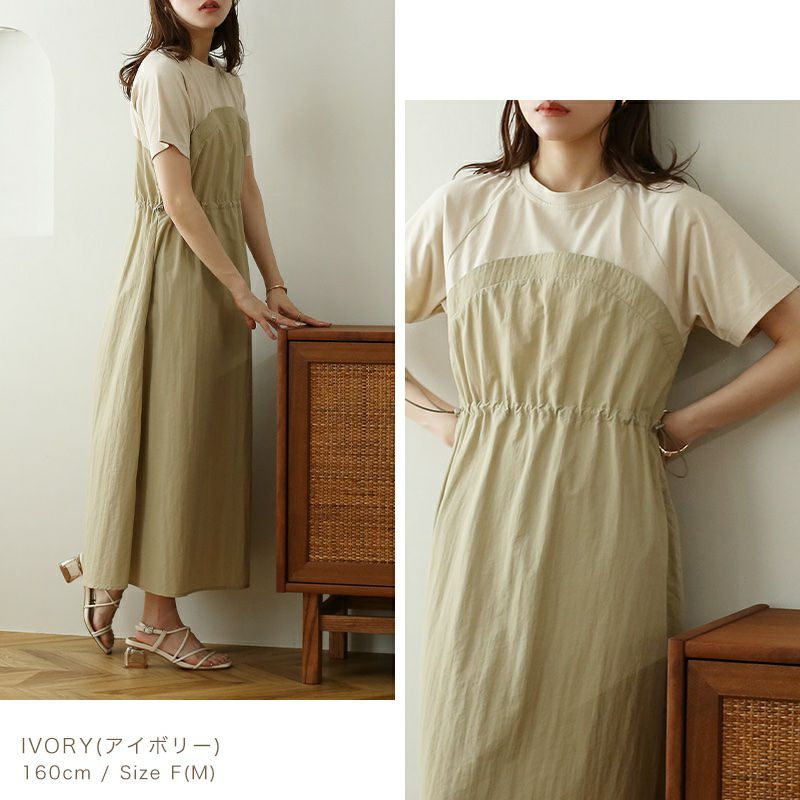 Tシャツにベアワンピースをレイヤードしているようなデザインが1枚でお洒落な異素材ドッキングワンピース。絶妙なニュアンスカラーにドロストデザイン×テック素材がカジュアルダウンしてくれる1着です♪