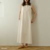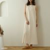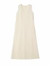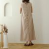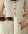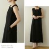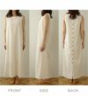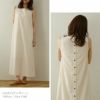 リネンライクな風合いが夏のナチュラルスタイルにぴったりなノースリワンピース。フロントのVネックが長めに入る事で、縦ラインを強調し、スマートに着こなせます♪バックデザインのボタンは足元まで付いているため、スリットの長さを調節でき、両サイドのポケット付きが嬉しいポイント◎