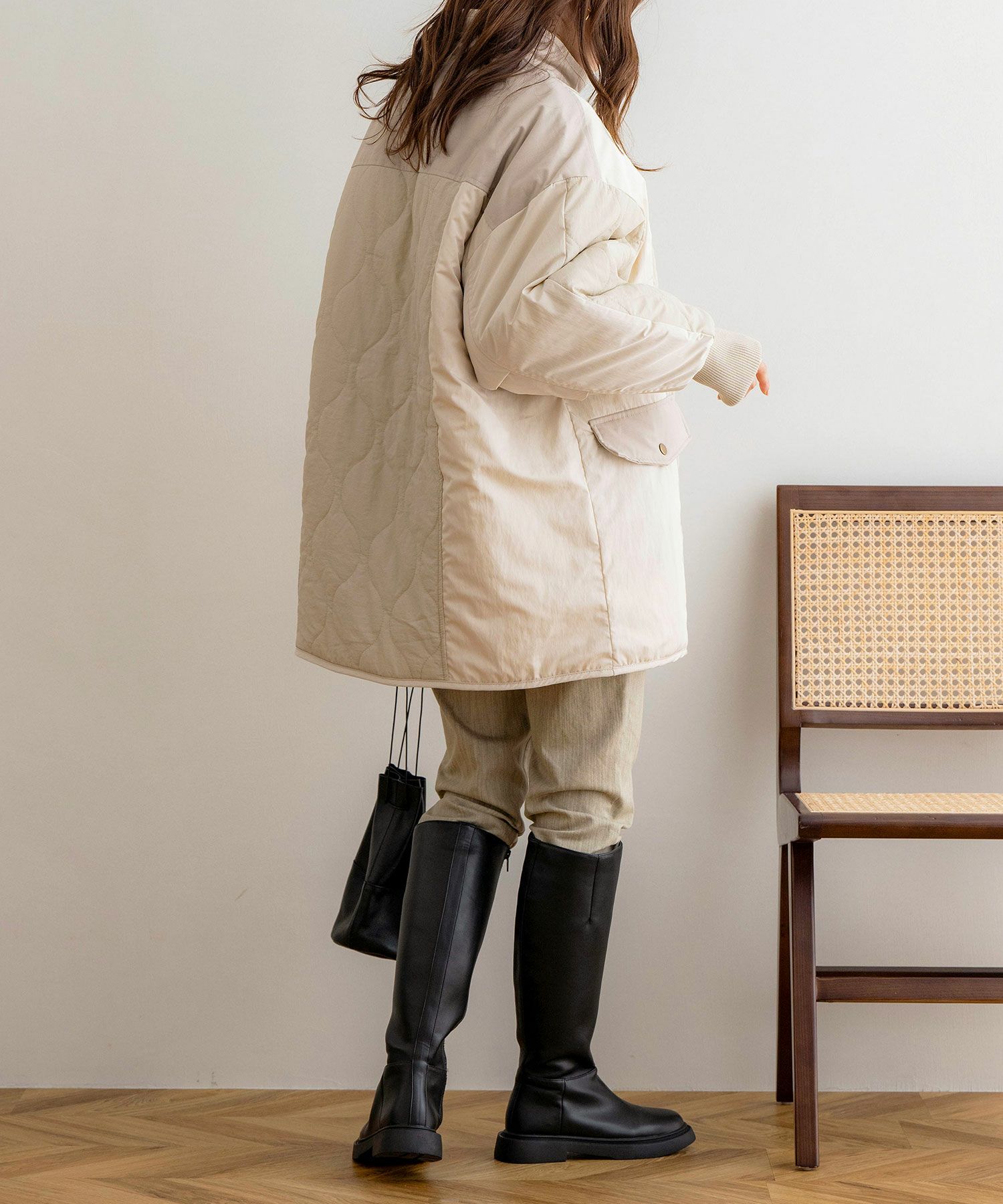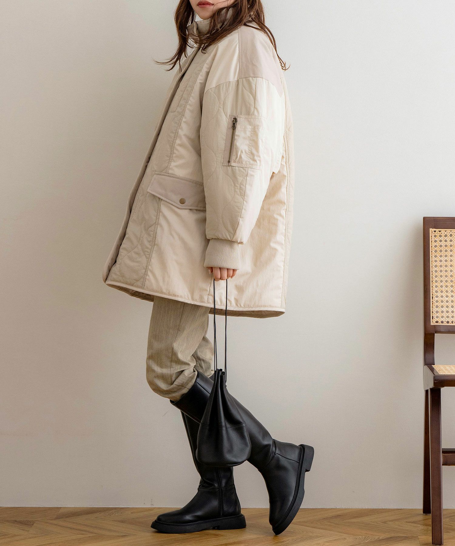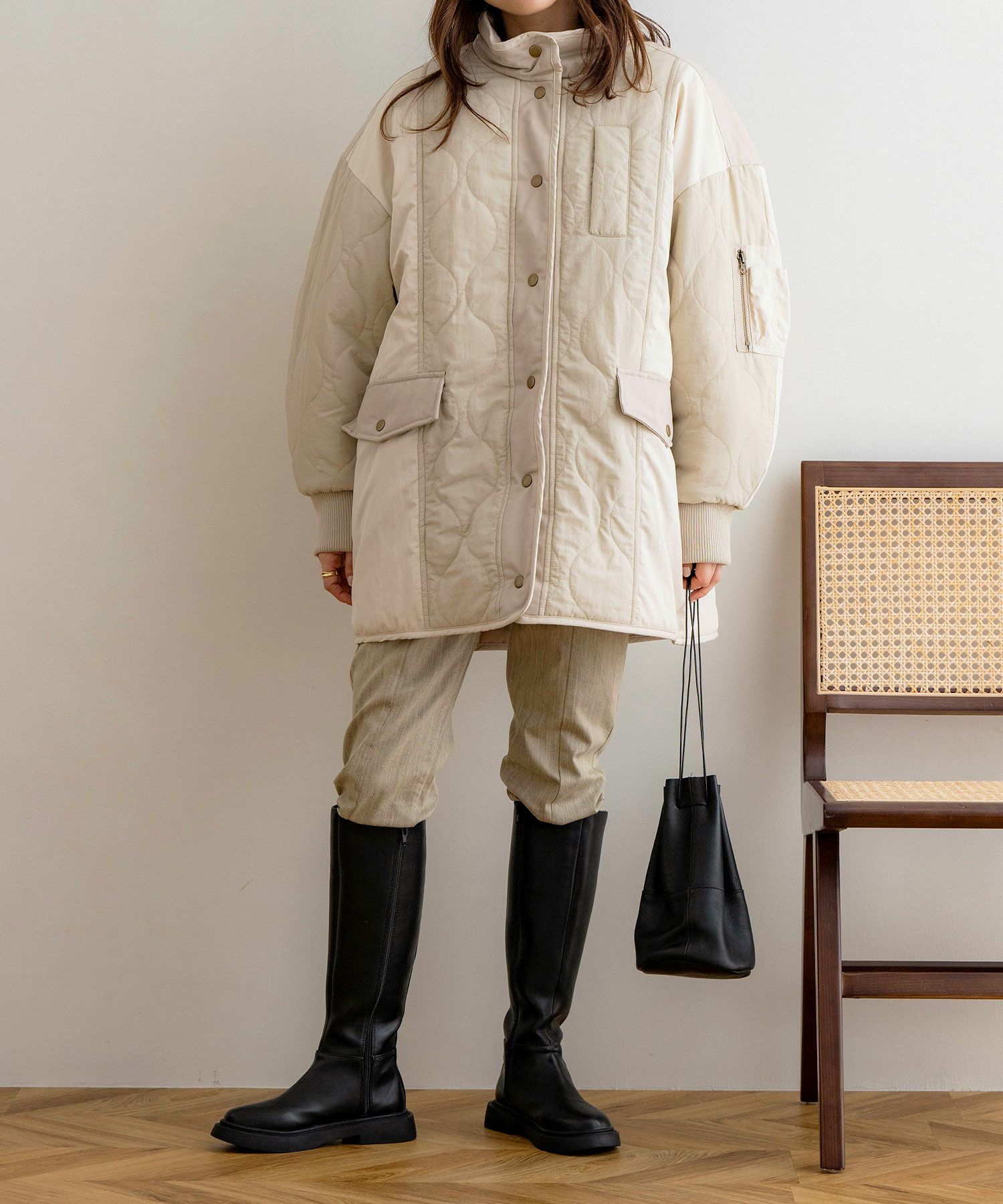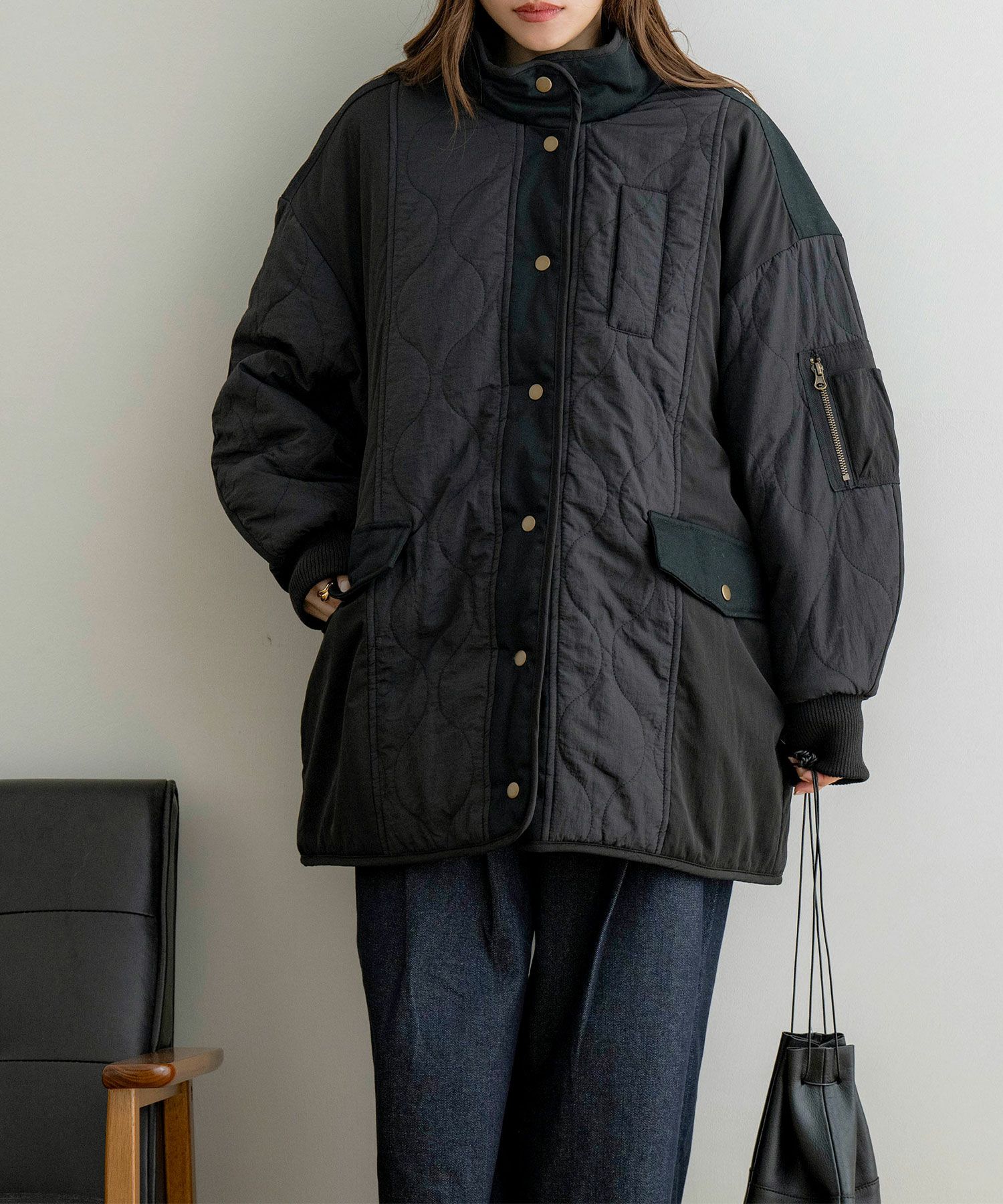配色×キルティングが特徴的なミドル丈アウター。中綿入りで、軽量ながら防寒対策もバッチリ◎太ももまで隠れるミドル丈なのも暖かポイント!スタンドネックでマフラーいらずな1着です♪