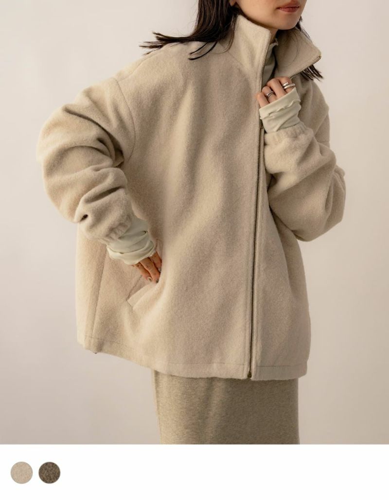 ふんわりとしたボア素材が、優しいぬくもりを感じさせるジップジャケット。