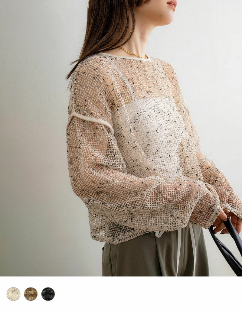 MIX糸のメッシュニットが合わせるだけでお洒落なショート丈プルオーバー♪コーディネートの主役にぴったりな1着です。インしなくてもすっきり見えるショート丈はどんなボトムとも相性抜群◎