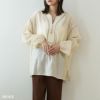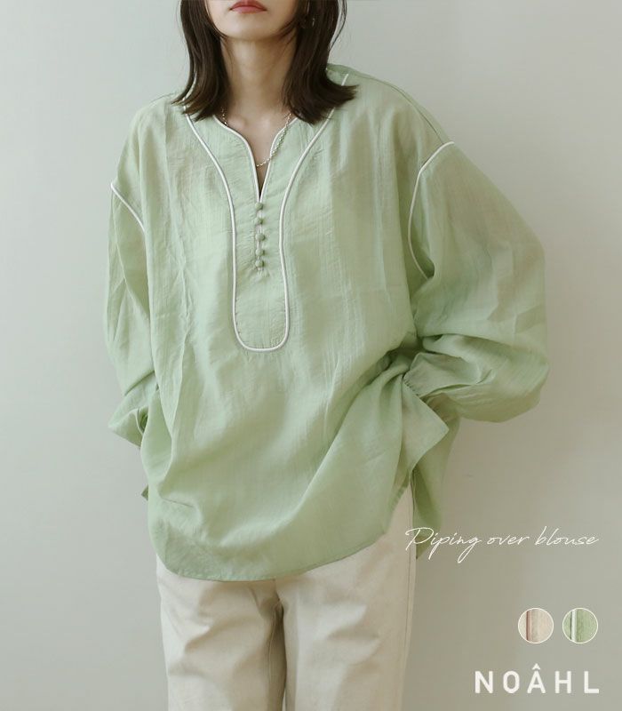 配色のパイピングとくるみボタンがアクセントのデザインブラウス。1枚でも安心感のある、腰回りやヒップラインをしっかりカバーする長めの着丈が嬉しい1着です。ふんわりとボリュームのある袖が全体のシルエットにゆとりを持たせ、こなれた雰囲気に。生地は若干の透け感とオトナなツヤ感があり、春夏シーズンらしい爽やかで清涼感のある見た目に仕上がっています。トレンドライクなピスタチオカラーとBASICなベージュカラーの2色展開でご用意しました。気負いすぎないデザインで休日にぴったりのノアルオリジナルのブラウスです。