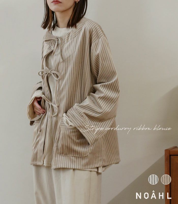 ストライプコーデュロイリボンブラウス