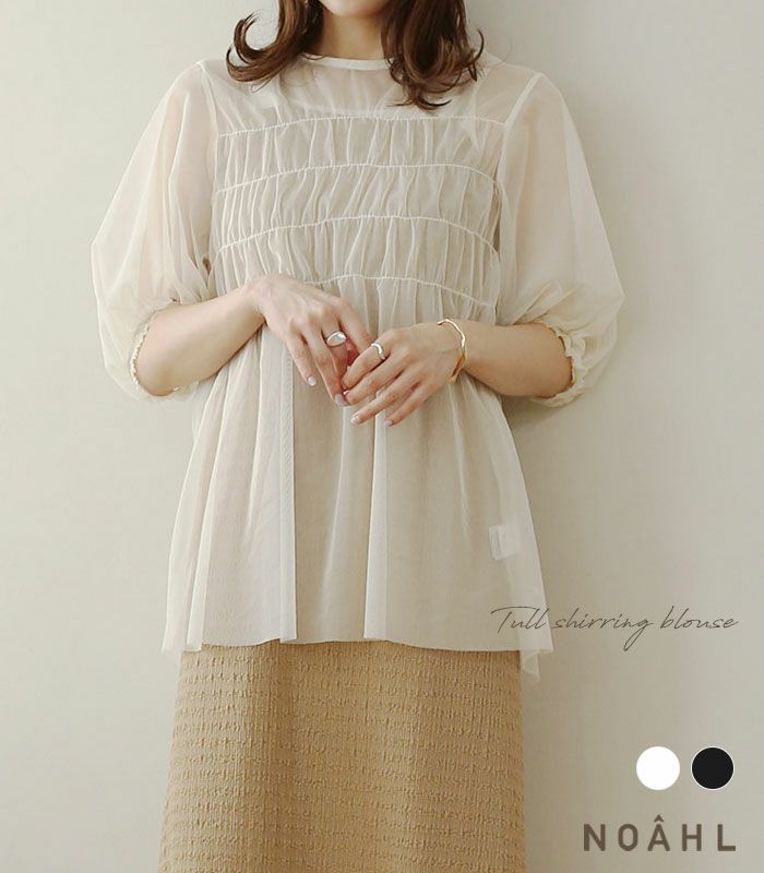 チュール素材の透け感が夏にぴったりのブラウス。シャーリング仕様がデザイン性ある1着。