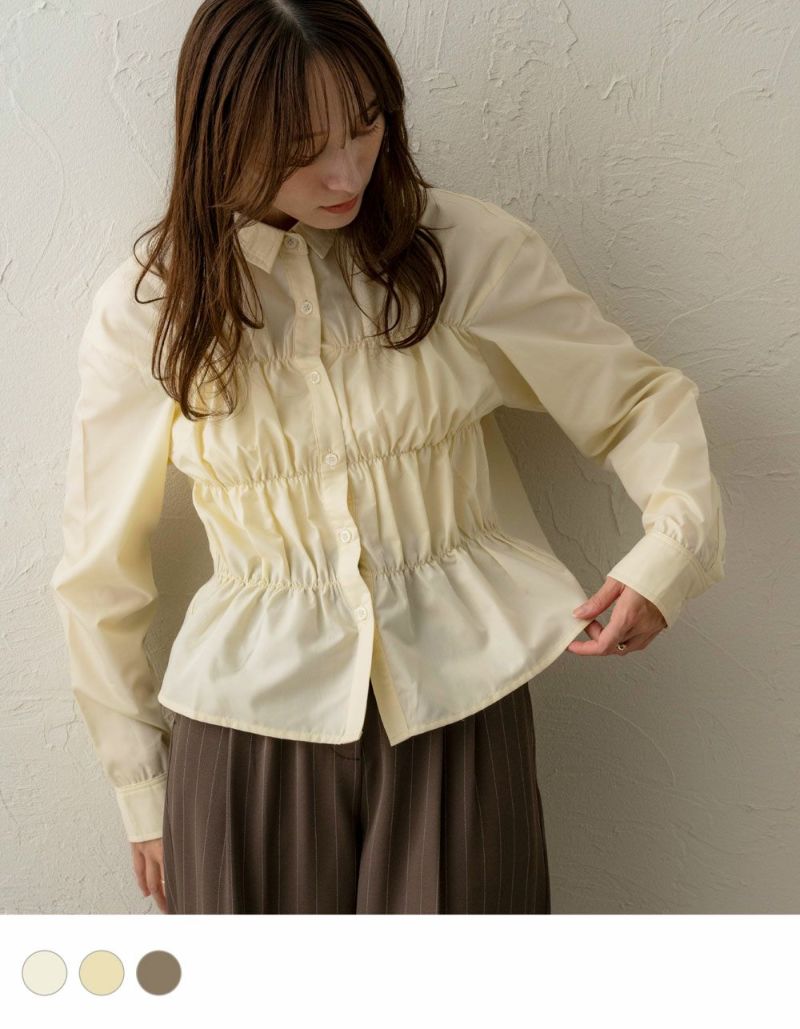 フロントのギャザーデザインが目を惹く主役ブラウス。