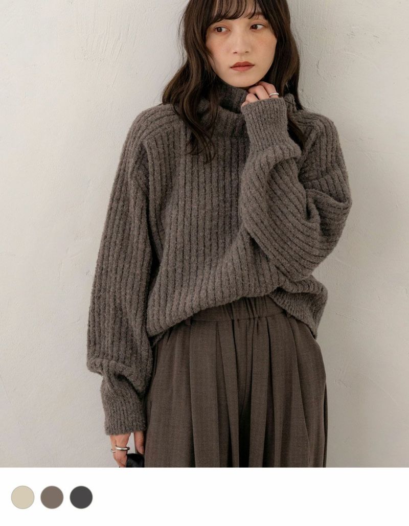 冬らしい落ち着いた大人カラーとハイネックが大人ナチュラルなニットトップス。