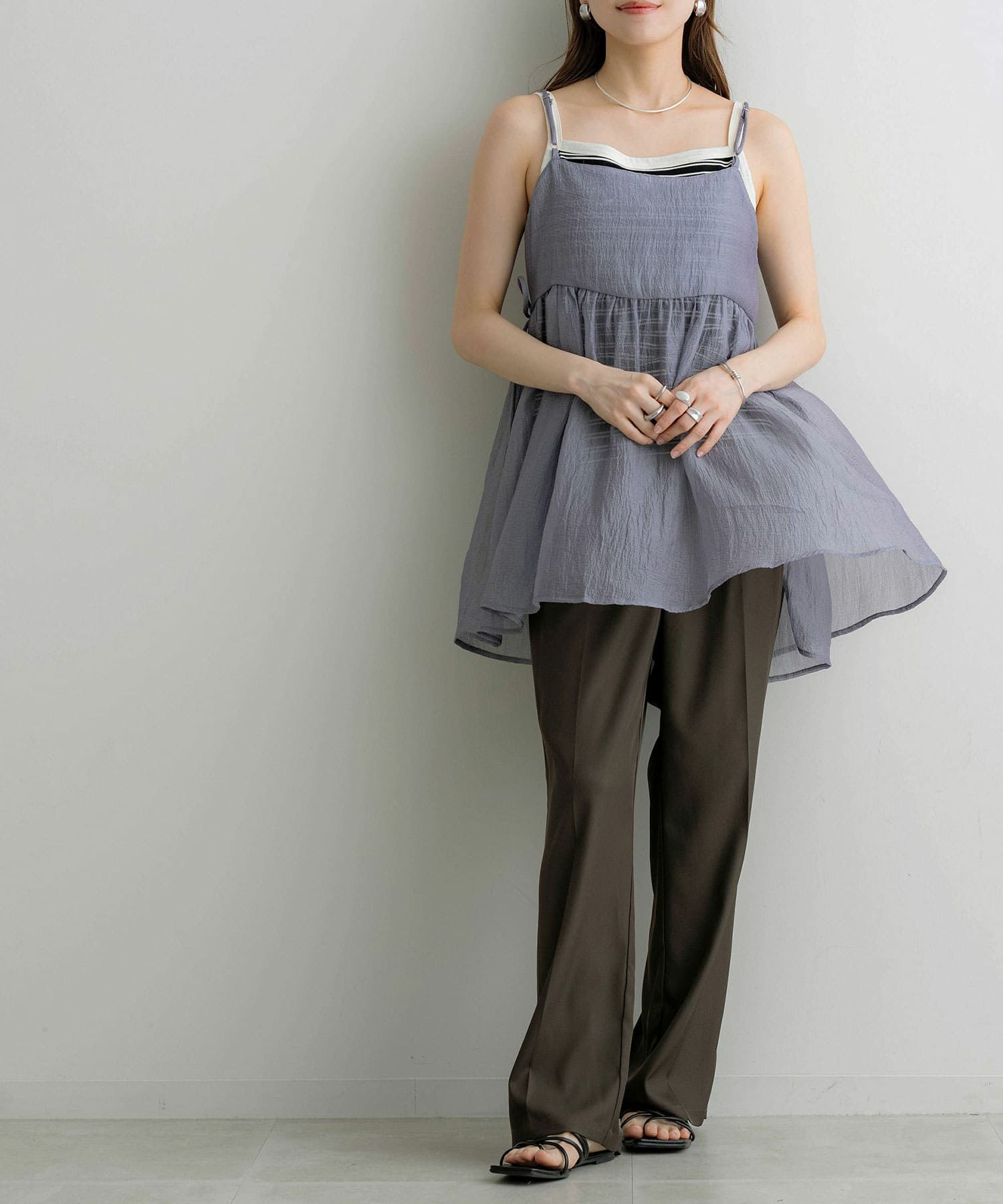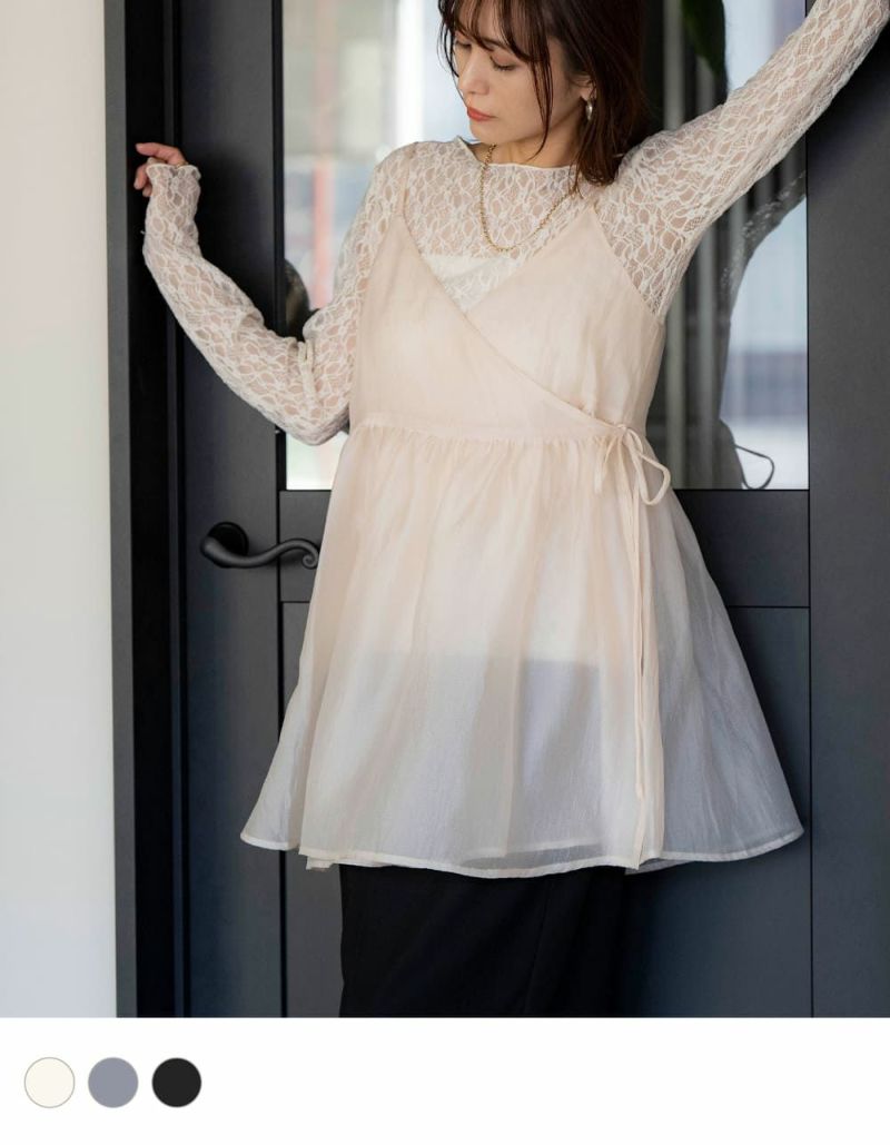 Tシャツやタンク、シアートップスなどシンプルなコーディネートに合わせるだけで華やかにお洒落見えするキャミトップス♪カシュクール×リボンのデザインが女性らしく、細かいラメが織り込まれたシアー素材が程よくキラキラしてシーズンムード漂う1着です◎