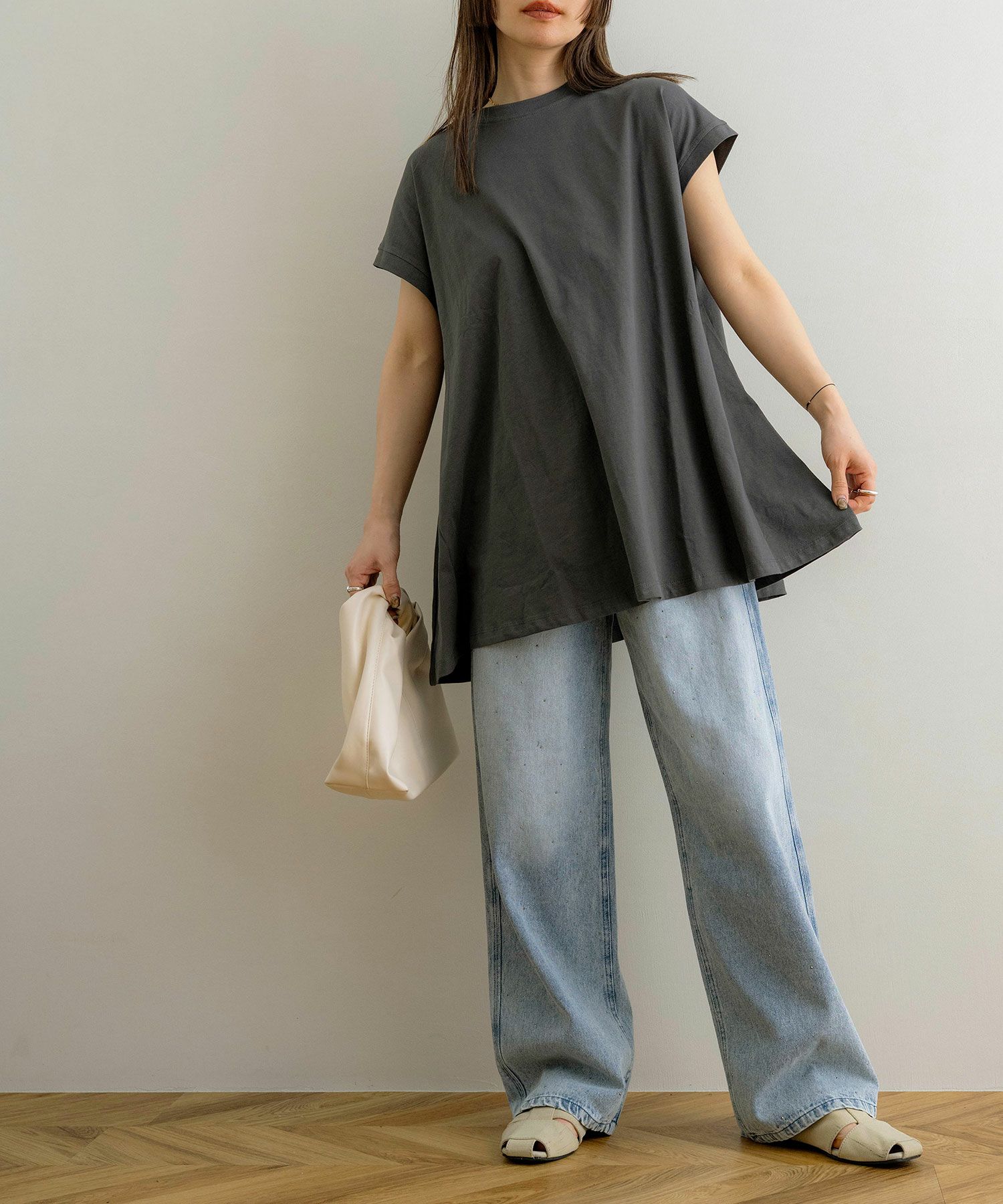 フレンチスリーブに裾の広がったゆったりしたシルエットが可愛らしいコットンTシャツ。柔らかい肌触りのいい生地が春夏にぴったりな1着◎