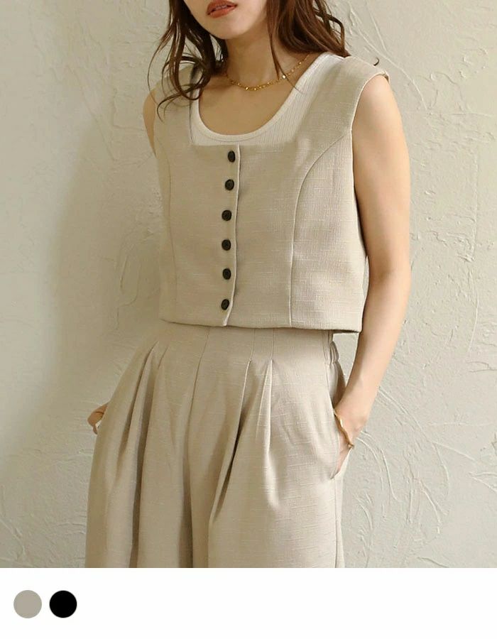 リネンライクな表情のある素材がコーディネートのポイントになるビスチェ。スクエアネックで首元をすっきりとした印象に♪同素材のパンツと合わせたセットアップスタイルもおすすめ◎