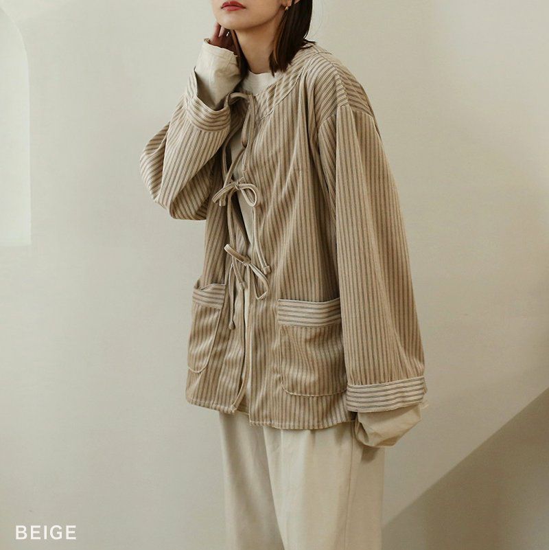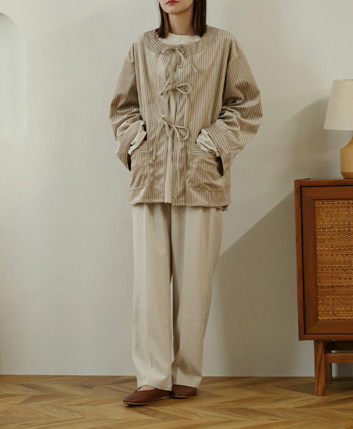 ストライプコーデュロイリボンブラウス