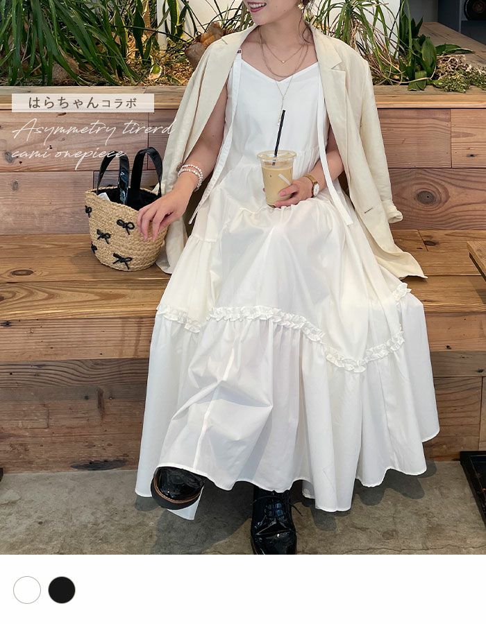 商品紹介 【はらちゃんコラボアイテム】アシンメトリーなティアードデザインが目を惹くキャミワンピースは、太って見えがちなギャザーデザインもできる限り太って見えないことを意識したシルエットで着痩せを実現。着痩せ術のプロが生み出した他にはない1着です◎斜めに入ったティアードデザインが甘さの中にもスタイリッシュなお洒落さをプラス。肩紐調整で胸元の空き具合や着丈を変えるとスタイリングの幅も広がるワンピースが完成しました♪
