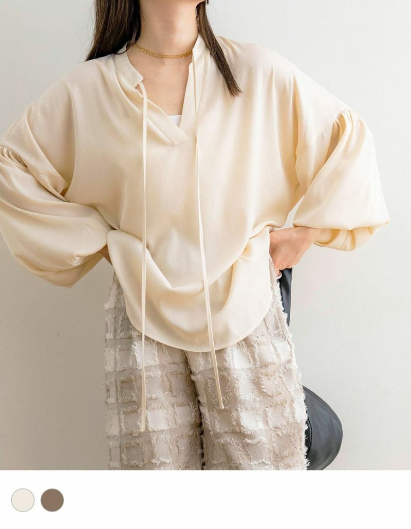 スキッパーデザインが顔まわりをすっきり見せ、抜き襟でこなれ感のあるブラウス。肩のラインを落としたドロップショルダーに、ふんわりボリューミーな袖が女性らしい1着です♪程よい光沢感が上品なシャイニー素材に、さりげなく楊柳加工を施しナチュラルに仕上げました。襟元の紐は、結んだり垂らしたりして雰囲気を変えられます◎
