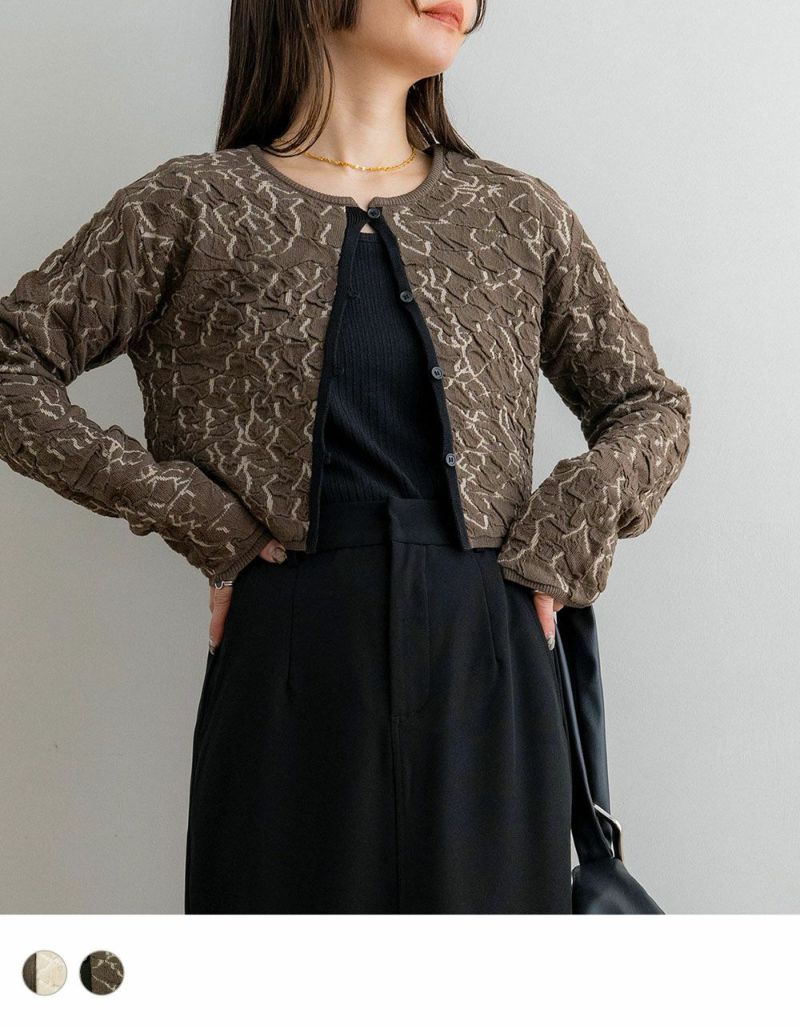 膨れジャガードの表情がオトナ可愛いショート丈カーディガン。