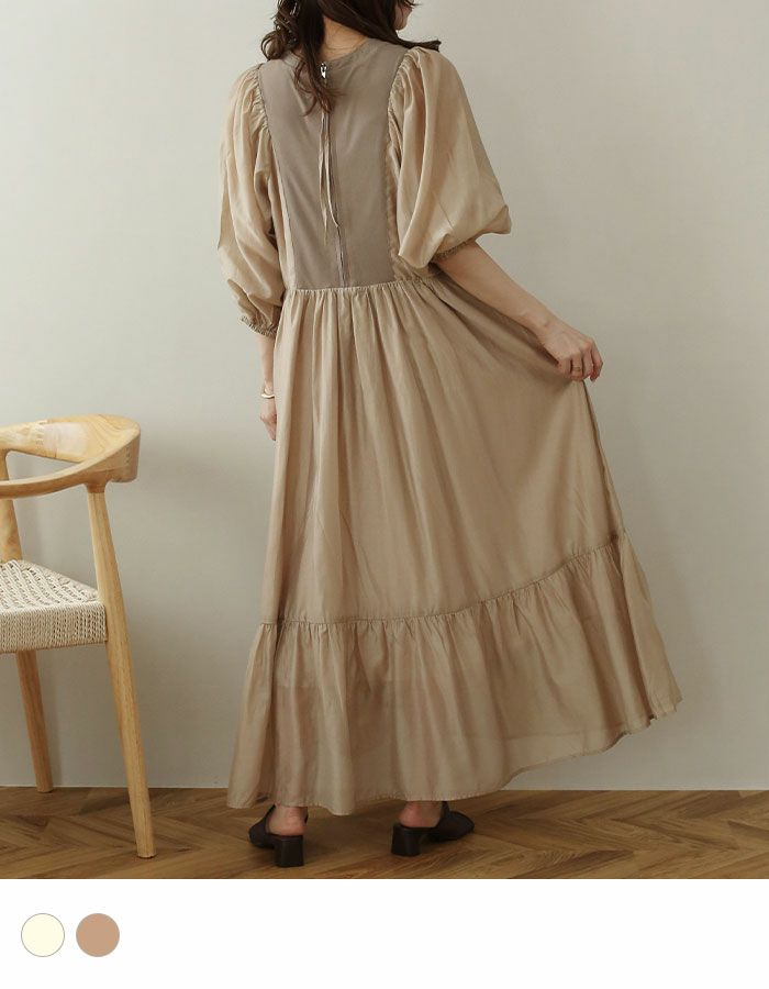ドッキングデザインに、シアー素材が夏らしいロングワンピース。Vネックデザインでデコルテ周りをすっきり見せ、ボリュームたっぷりのギャザー切り替えがふわっと女性らしいシルエットに♪