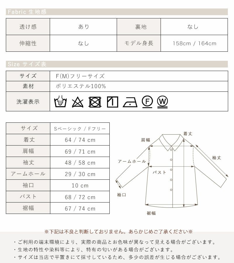 対応が早くてありがたいです! ベージュのFとオリーブのFを購入しました。 他のレビューにもありましたが、ベージュは写真より少し濃いめです。 オリーブは色移りの注意を入れていただいたりと配慮した対応でした。 153cmなので、フリーは大きいかな?と思いましたが、それほど丈は長くなく袖は長めでした。 これ、Sじゃないかな?くらいの丈感です。 ハンガーに掛けてみたら、裾より袖が長いです。 画像では、Sは袖の方が長くFは同じ長さくらいだったのですが。。。 生地は柔らかくて透け感も程よく長い季節に使えそうです。