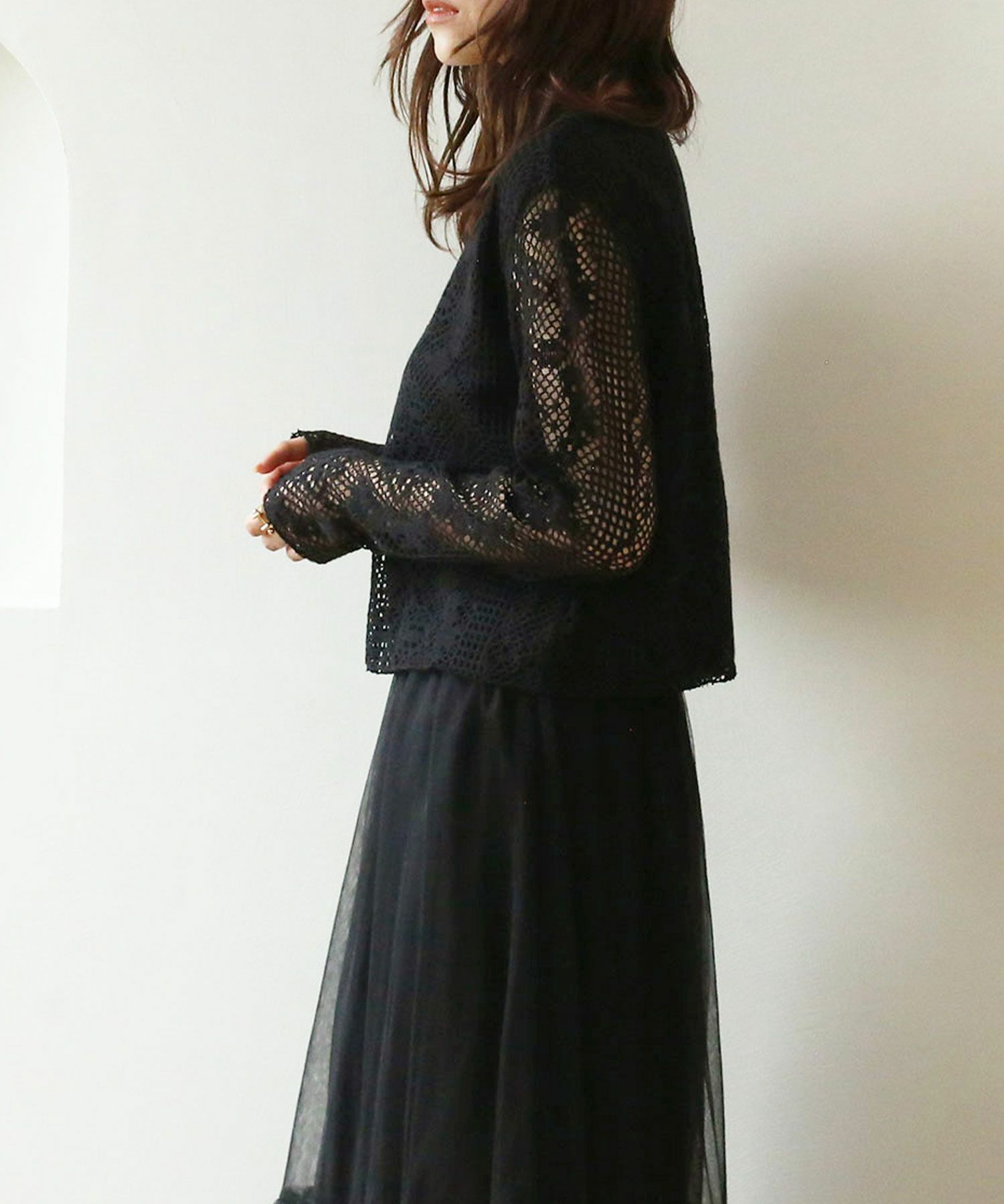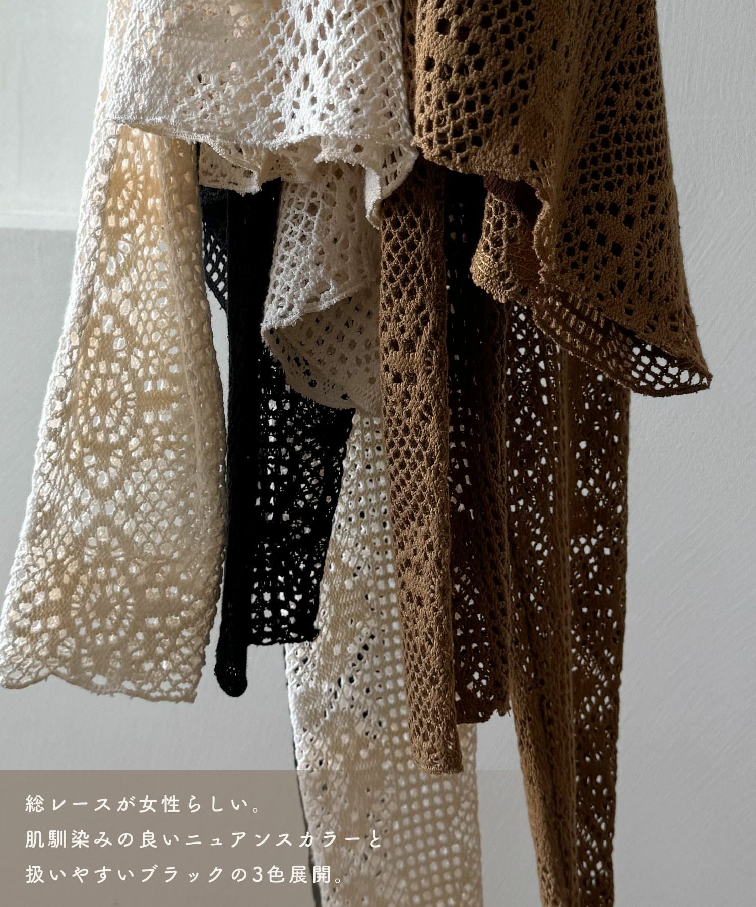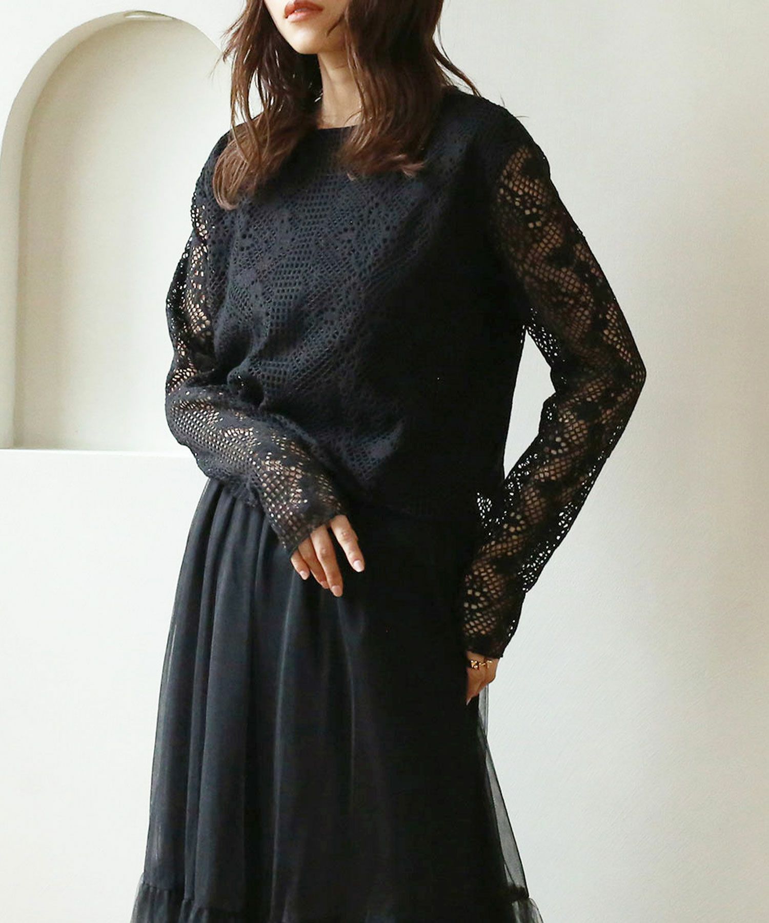 総レースが女性らしいプルオーバー。身体のラインを拾わない程度のタイトなサイズ感と、インしなくても良いコンパクトな丈感ですっきりとした着こなしが叶います♪総レースなので1枚でもシンプルにならず、キャミワンピースのインナーとしても活躍してくれる1着です。