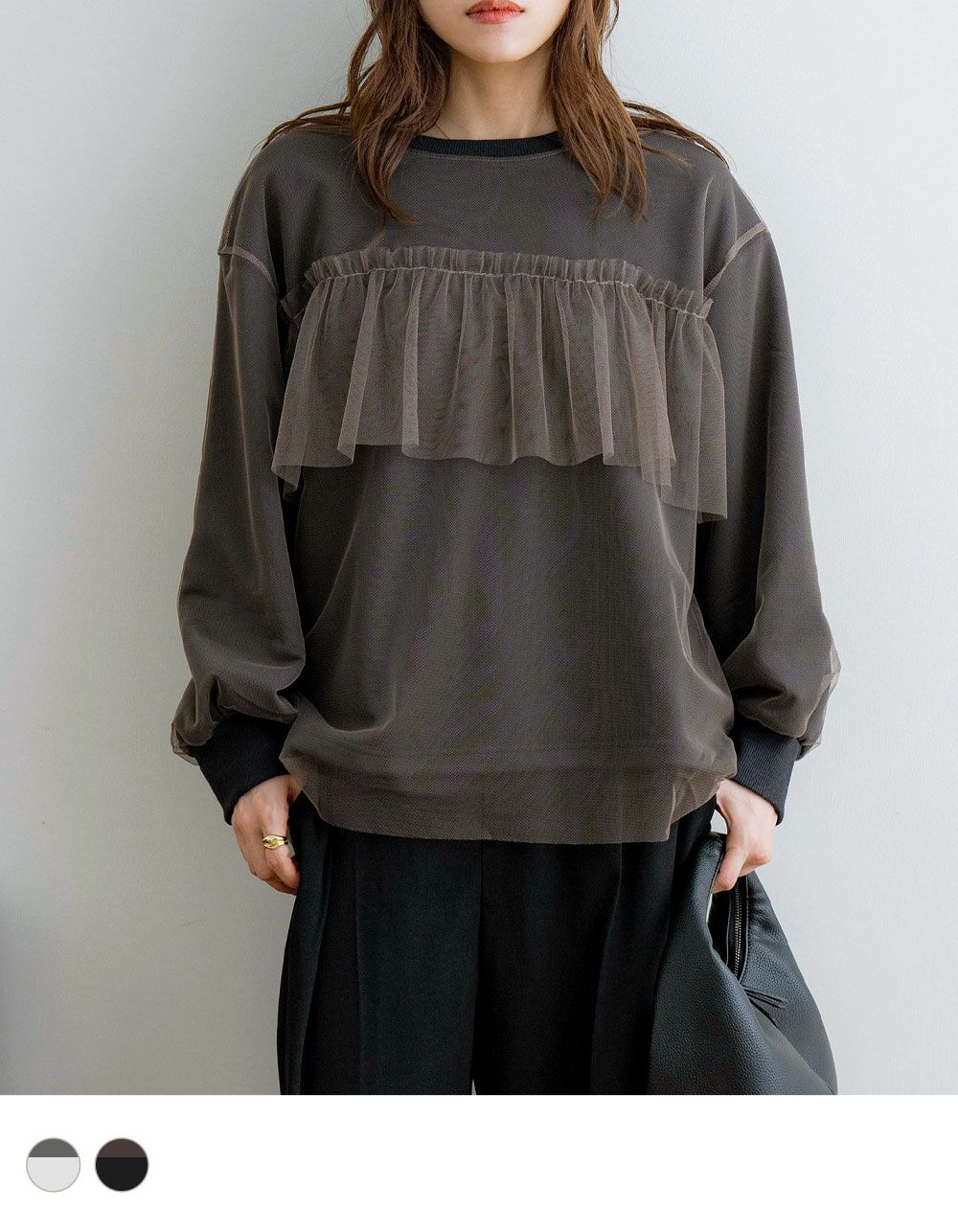 程よいシアー感とフリルが今年らしく大人可愛いトップス。チュールとフリルが程よくコーデに甘さをプラスしてくれます♪1着でおしゃれ見えするレイヤードデザインが◎