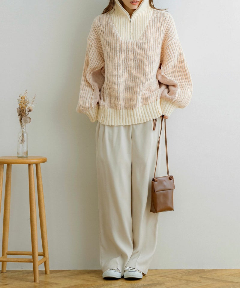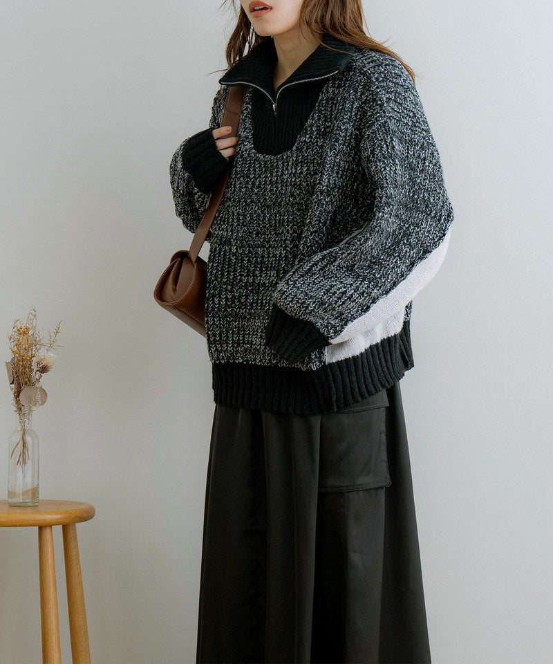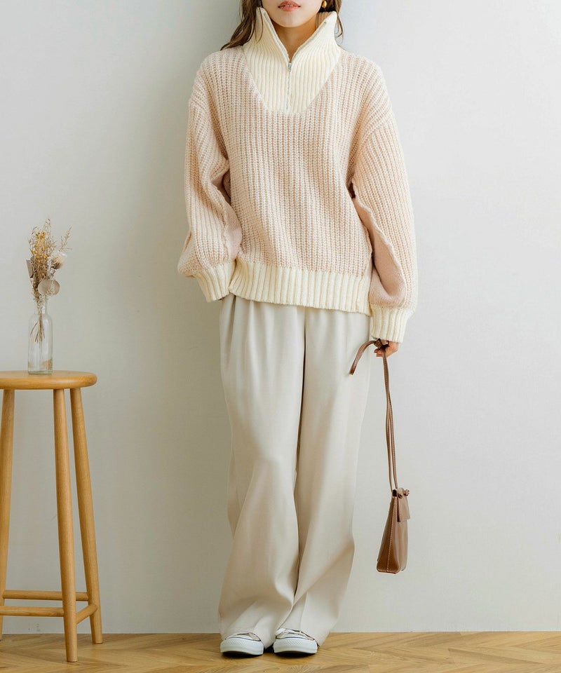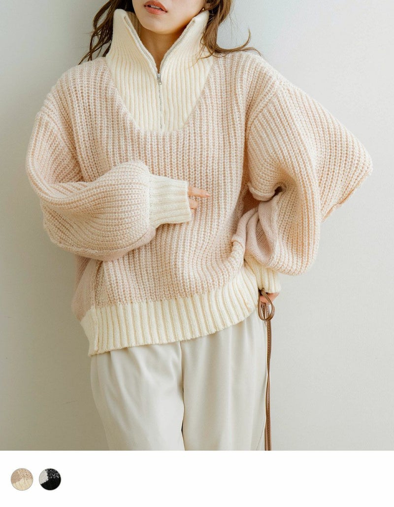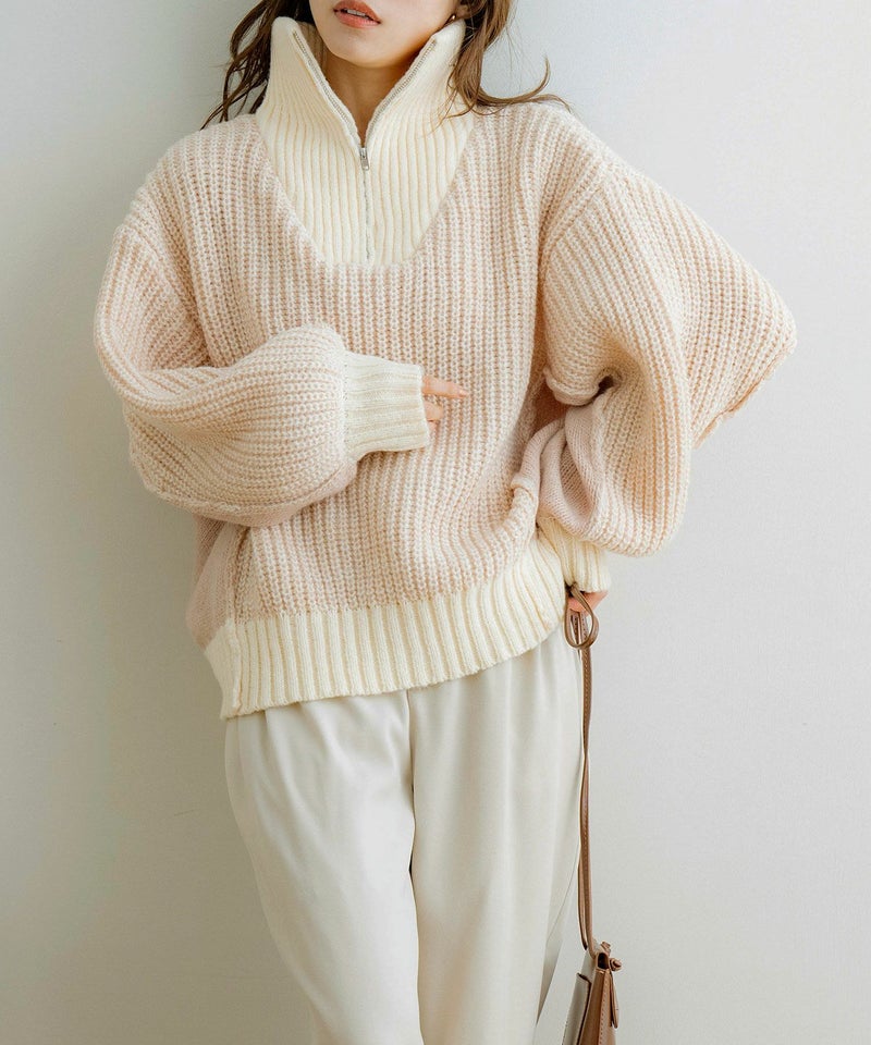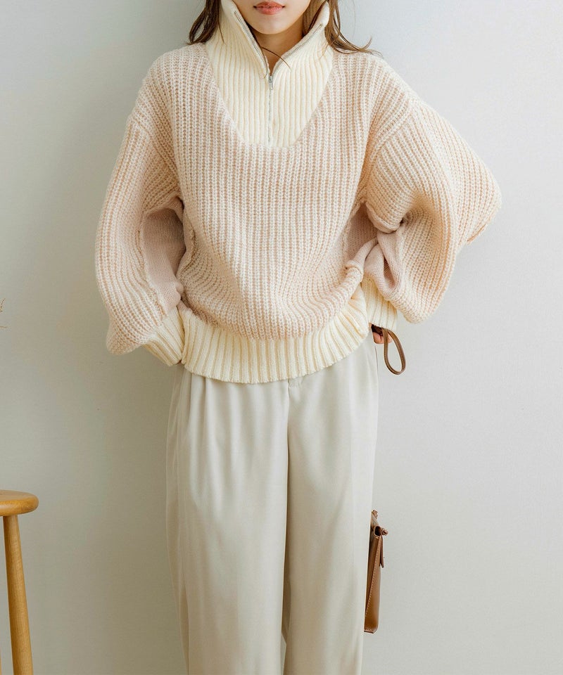 ハーフジップ配色ニットプルオーバー