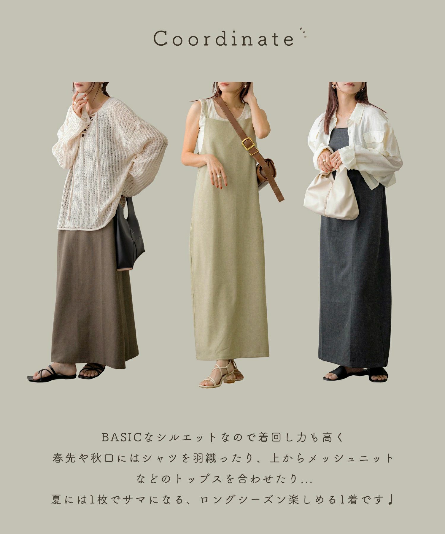 シンプルなシルエットながらも、春らしくNOAHLらしいニュアンスカラーにMIX感がコーディネートを華やかに見せてくれます♪すとんと落ち感のある素材がきれいなIラインシルエットを造りすっきり見せつつ、タイトすぎないので気負わず着られます◎BASICなデザインなので、中にインナーを合わせたり、シャツやジャケットを上から羽織ったり、幅広いスタイリングができ、着回し力の高いワンピースです。アシンメトリーなストラップは調節が可能で低身長さんから高身長さんまで好みの丈感で着ていただけます♪