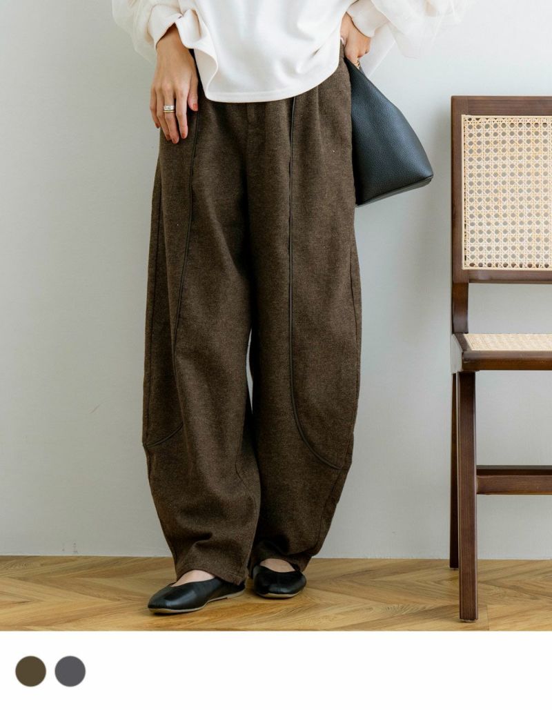 ツイード生地がおしゃれなカーブパンツ。ゆったりとしたシルエットに、パイピングデザインがアクセント♪ポケットがあるのも嬉しいポイントです。