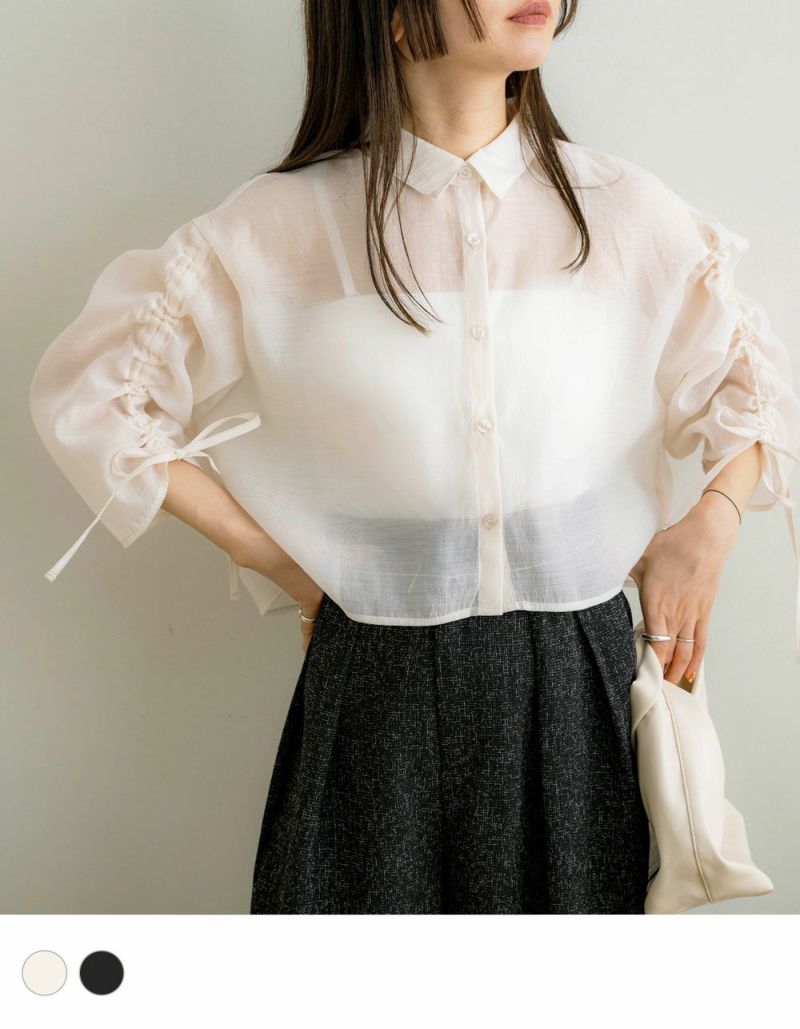 袖のギャザーデザインがポイントの春夏にぴったりなシアーシャツ。1枚でも羽織としても着られて、ギャザーの調整による五分?七分袖が涼しげな1着です◎