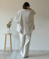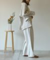 拘ったのはジャケットだけどカッチリしすぎない、まるでカーディガンのような”まぁるい”シルエット。えり抜きスタイルがバッチリきまる、抜け感たっぷりのゆるジャケットです。秘密は、肩のラインを落としたドロップショルダー、身幅にゆとりをもたせたオーバーシルエット、さらに絶妙なコクーンシルエットに仕立てることで、自然にゆるさや抜け感の出る1着が完成しました。同じ生地を使用したパンツとのセットアップスタイルもおすすめです。ジャケット嫌いさんにこそ選んでほしい、そんな1着です。