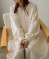胸元のくるみボタンやティアードデザイン、ぽわん袖が女性らしく、1枚でお洒落なロングワンピース♪Vネックで首元をすっきりと見せてくれ、小顔効果も◎