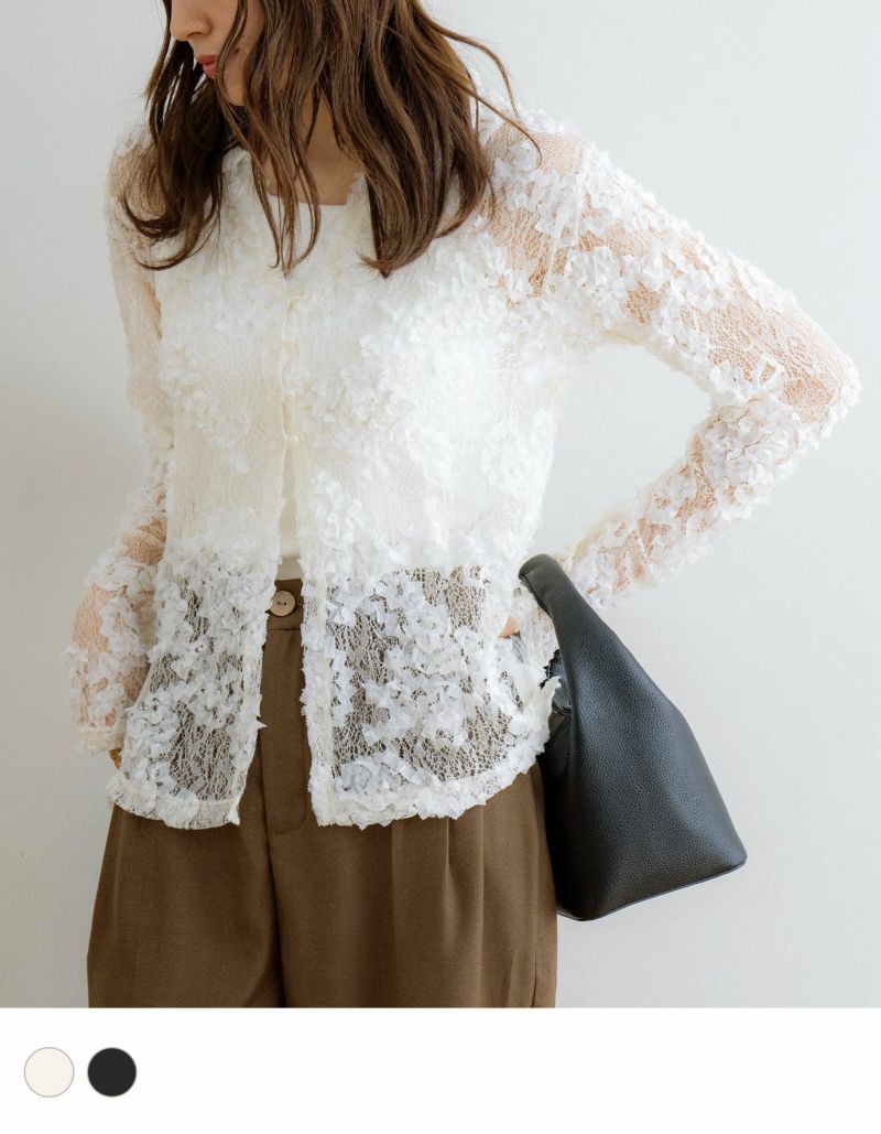 商品紹介 フリルやレースが大人っぽく女性らしいブラウス。レースの程よい透け感がおしゃれな1着です◎