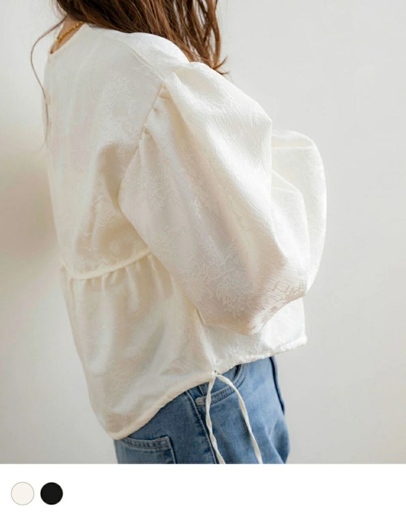 ヴィンテージ感のあるジャガード柄の、表情が大人っぽく女性らしいブラウス。裾のリボンや切り替え、ボリュームのあるシルエットがお洒落な1着です◎