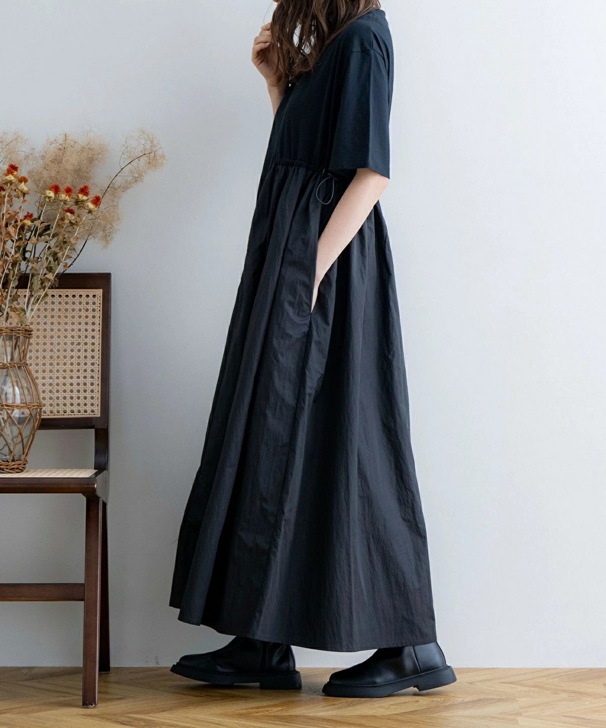 アシンメトリーなデザインが1枚でお洒落な異素材ドッキングワンピース。カジュアルな素材感と女性らしいシルエットが可愛らしい1着です♪