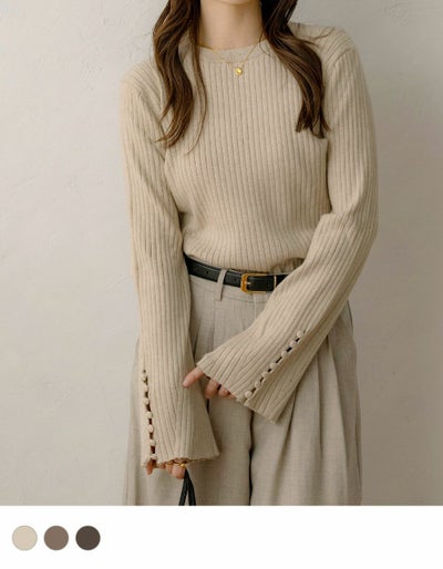ニットの肌触りが良く、伸びもいいので着心地が良いです。やっぱり手元のフレアとくるみボタンが可愛い!