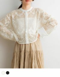 クロシェ編みが好きでこちらの商品も気になっているお品でした。 襟と袖口がサテン素材なのでシャツ感が増していて可愛いです。 クロシェ編みは伸縮性ない物が多いのでぽっちゃり体型には厳しいこともあるのですが、こちらはゆったり作られているのでとても着やすかったです。